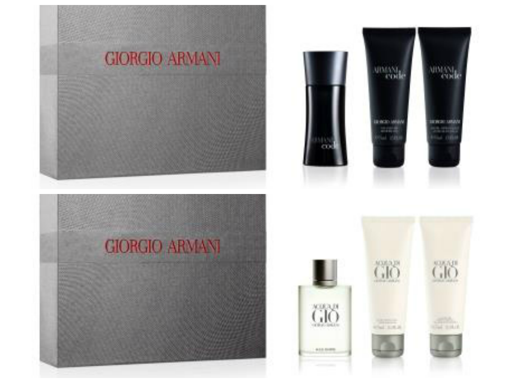 – Acqua di Giò, una fragranza esperidata, acquatica e sensuale, per tutti coloro che aspirano a uno stile di vita energico e moderno. 50ml spray + Gel Doccia 75ml + Balsamo Dopobarba 75ml euro 62,50